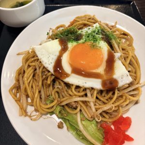 太いストレート麺に、出汁入りの甘口ソースが絡む、